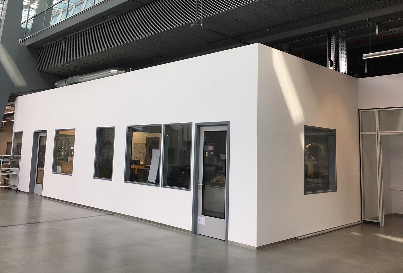 Raum-in-Raum Konstruktionen erschaffen ganz neue Möglichkeiten der Nutzung von großen Hallen und Bereichen. Abgrenzung und Raumnutzung in einem. (Gehen Sie mit der Maus über das Bild um den Vorher-Nachher Effekt zu sehen)